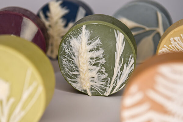 Scented with a blend of lemon myrtle, lavender and cedarwood to symbolise the soap motif. Eight colours available, please select the colour from the drop down menu. The plant reliefs will be chosen at random.