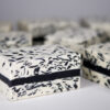 This simple yet elegant soap features a complex scent combination of citrus, patchouli, anise, spruce and a hint of mint. Its a strong and intriguing blend that is very much liked by our customers. The soaps were crafted for a small Easter exhibition with the theme of Black & white. As with the Rolling billows soaps, all of the sides have been planed and beveled to showcase the soap design.
