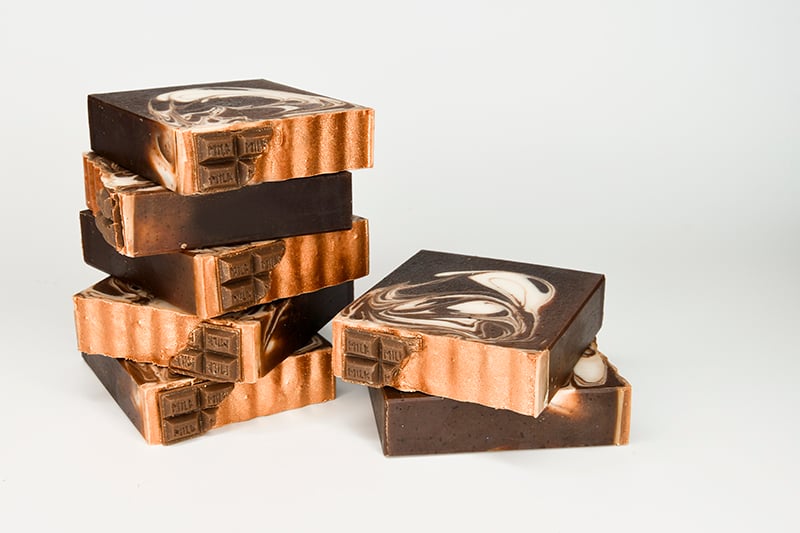 Be careful not to eat this one, it looks and smells like chocolate cake! We added almond meal for subtle exfoliation and honey for a rich and creamy lather. The soap strikes with white delicate swirls set in a dark chocolate colour, which has been achieved with the aid of cocoa powder and the vanilla content of the fragrance. Scented with a blend of cocoa therapy and almond fragrance. The soap top has been finished with a dusting of bronze mica and a tiny piece of (soap) chocolate on each bar.
