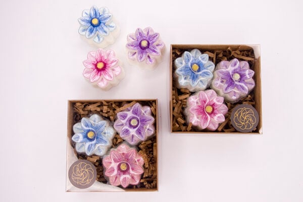 An exquisite and very unique gift box containing three mini shower steamers in flower shape that have been meticulously hand painted to achieve a 3D-effect. It is a lovely little gift to say thank you, give for Mother’s day or birthdays. Shower steamers are becoming increasingly popular and this is a great alternative to bath bombs or salts, especially to recipients who may not have a bath or have skin allergies. It’s a bath bomb for the shower – an aromatherapy treat! Each shower steamer is scented with lavender essential oil and hint of geranium fragrance, and will create a relaxing atmosphere in the bath room.