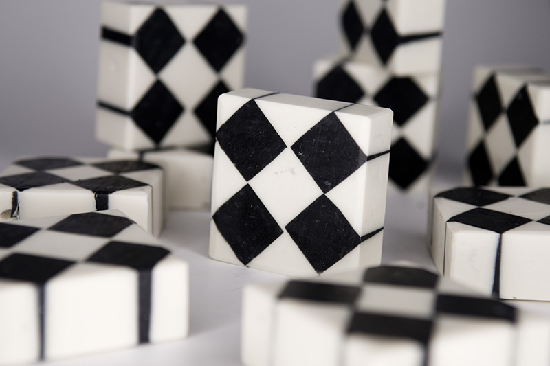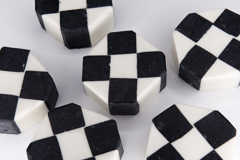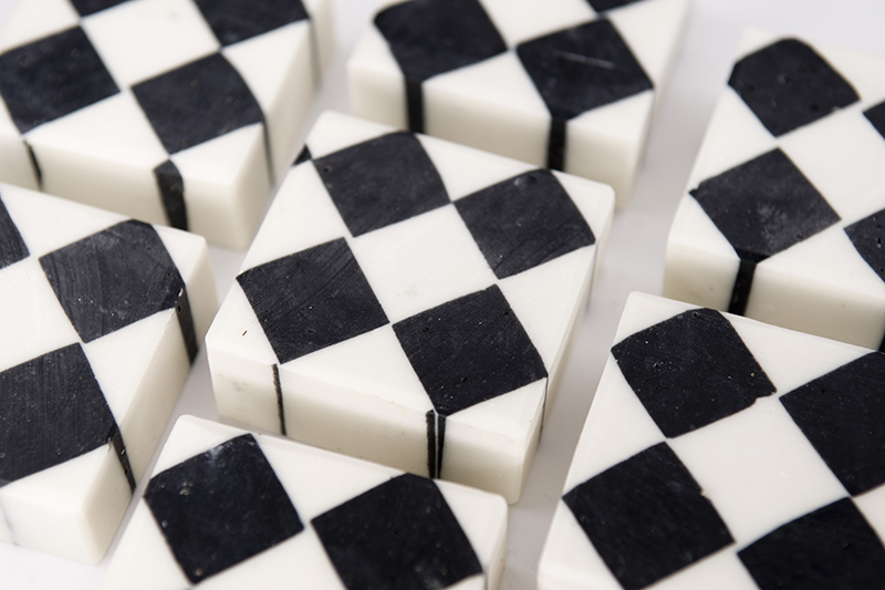 Harlequin was made for the 2025 Easter Art & Craft Trail exhibition with with theme Black & white. Making this checkered soap was super fiddly, but I always wanted to try, having seen this at the Soap Challenge Club. There are several steps involved, making the first soap in one colour, then cutting and trimming it, fixing it in a mould to make the pattern. Next is to pour the other colour, then again cutting and planing. The end product is truly stunning and will make a great gift! The soap is scented with a blend of orange, clove, cinnamon and ginger – the same as our orange turmeric soap.