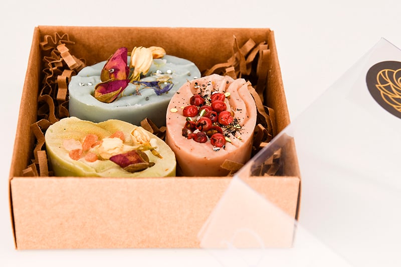 All soaps will arrive with you ‘naked’ with ingredient labeling attached to the back of the soap. Soap boxes are available at a small surcharge and can be selected before adding the soap to your cart.