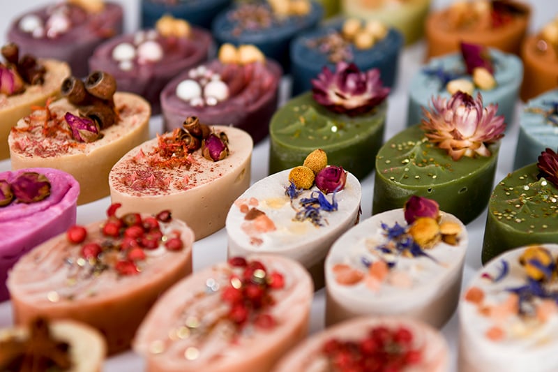 Ingredients: olive, coconut, palm (RSPO certified), rice bran, sweet almond, castor, grapeseed, avocado, canola, sunflower oils, water, sodium hydroxide, fragrance, essential oils, sodium lactate, kaolin clay, poppy seeds, oatmeal, cocoa powder, turmeric, orange peel, aloe, madder root, indigo, botanicals, cosmetic grade oxides/micas, biodegradable glitter