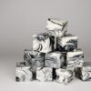 Mini cubes with exciting black and grey swirls in a white base. In love how they turned out, each side will have you captivated in the different patterns that were created when the fluid soap batter was poured into the moulds. These minis were created for a small Easter exhibition with the theme of Black & white. Stormy sky mini cubes at your sink or guest bath room will sure be a statement piece and also makes a nice little gift idea. Scented with Energy fragrance, a fruity citrus blend. Gift box option for four mini cube soaps available here.