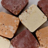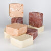 The square salt & clay bars feature three different shades that have been achieved with various clays that are the only colouring agent used in these soaps. They are made with sea salt and some accents of Himalayan pink salt, resulting in a soap that can be harder than others and share skin benefits like a swim in the ocean. This batch of salt & clay bars is scented with cucumber & spearmint, an absolutely divine fragrance combination that is fresh and unisex. They were made for an exhibition with the theme Of the earth.